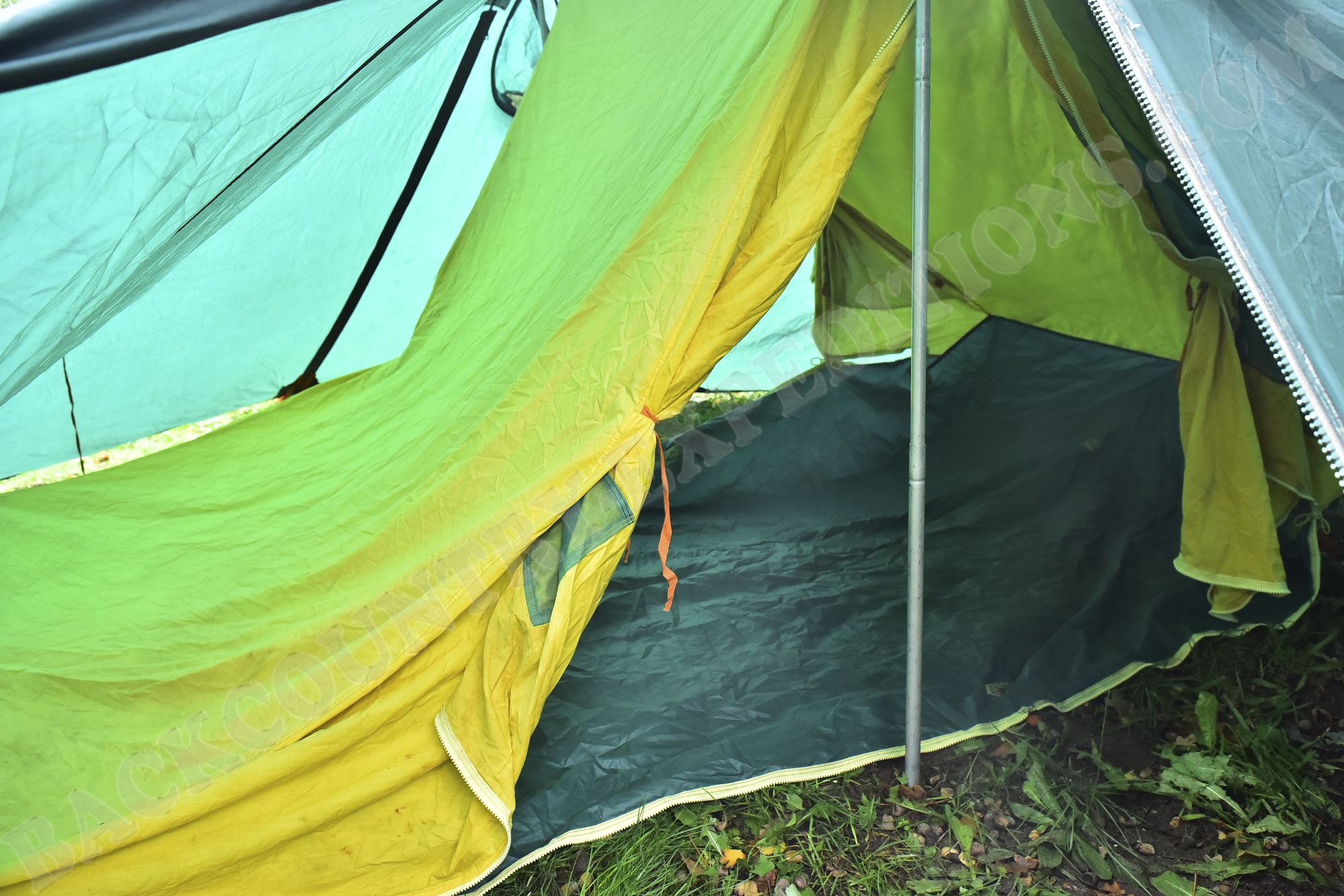 Ansonsten erscheinen alle Nähte gut verarbeitet und ausreichend robust, nur die Silikonbeschichtung löst sich nach all den Jahrzehnten sichtbar auf, und müsste gewiss erneuert werden. Die einzigen wirklichen Defekte waren zwei am Innenzelt ausgehakte Reißverschlüsse, für deren Reparatur wahrscheinlich die Endnähte geöffnet und wieder neu vernäht werden müssten.
