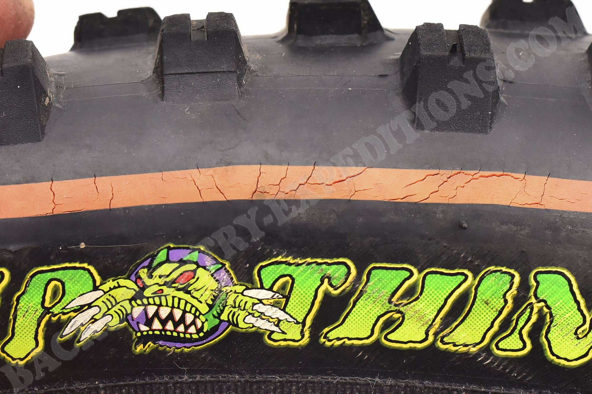 Der Wetscream ist mit seinen 2.50″ und 55mm sogar noch einen Millimeter schmaler als der SwampThing, besitzt die gleiche Empfehlung für den Reifenluftdruck (kann aber auch mit 1,5 bar gefahren werden), und eine Tragslastangabe von maximal 90kg. Es gab ihn damals auch noch in der Breite 2.20″, und der Gummimischung 60a, was in genau dieser Kombination speziell für das Hinterrad Sinn macht.