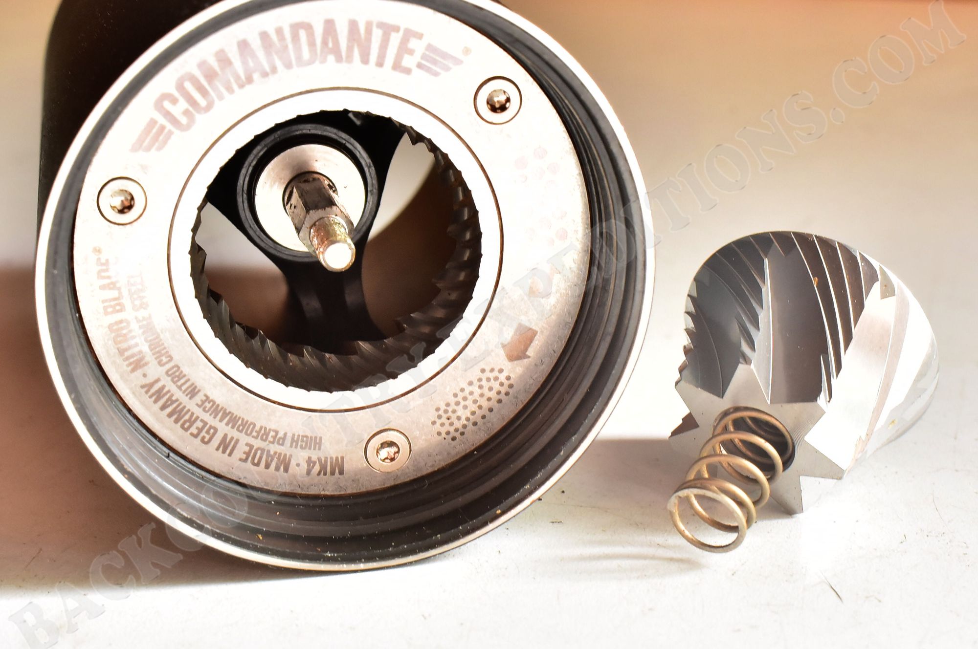 Die Mittelachse aus Edelstahl wird von zwei Edelstahlkugellagern geführt, auf ihr sitzt mit einem Magneten die ergonomische Kurbel mit austauschbarem Click-on-Knauf. Der 3-fache Klickmechanismus des Mahlwerkverstellers rastet satt ein, ohne sich unbeabsichtigt während des Mahlens zu verstellen. Beim Lösen der Verschraubung kann der Konus mit Stahlfeder herausgenommen und mit einer Bürste gereinigt werden. Der mit Spezialschrauben werksseitig zentrierte Mahlring hingen sollte laut Hersteller auf keinen Fall ausgebaut werden, die Mahlwerkzähne mit ihren Mikro-Klingen können auch von außen gereinigt werden.