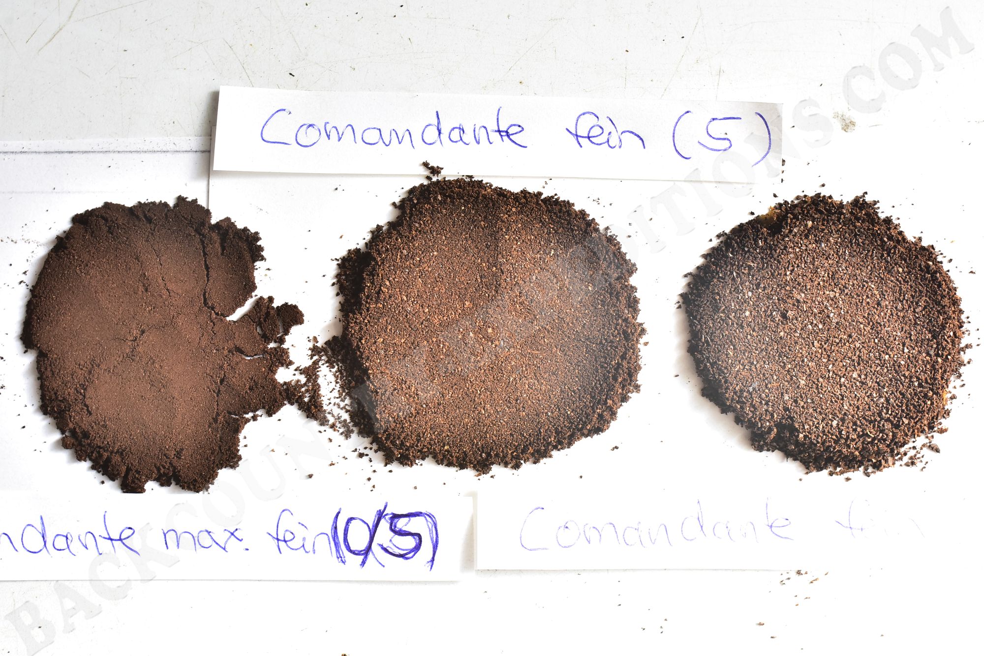 Folgend die Mahlergebniss fünf unterschiedlicher Einstellungen, von minimal fein bis maximal grob, wobei das erste feinste Ergebnis der Klick-Nullpunkt ist, das zweite bei 5 Klicks, dann 10, 25 und 40 Klicks.